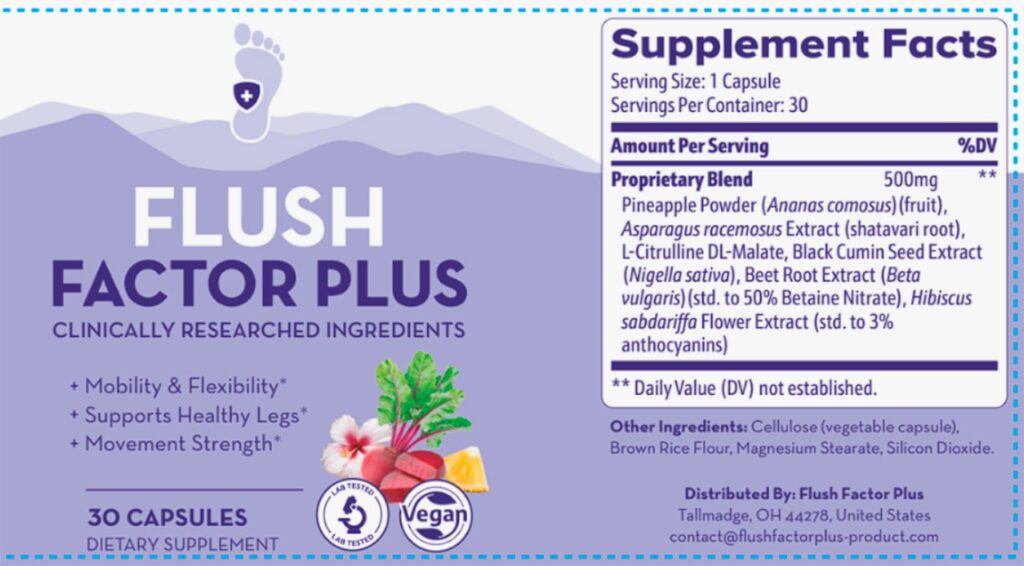Flush Factor Plus is a supplement specifically designed to relieve the swelling, discomfort, and heaviness caused by fluid retention in the legs, ankles, and feet. Its advanced formula is backed by research and combines scientifically proven ingredients that help balance fluid levels, support healthy circulation, and reduce inflammation.